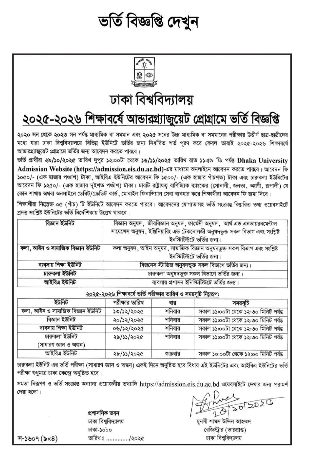 ঢাকা বিশ্ববিদ্যালয়ের রেজিস্ট্রার (ভারপ্রাপ্ত) মুনসী শামস উদ্দিন আহম্মদ স্বাক্ষরিত বিজ্ঞপ্তির তথ্য অনুযায়ী, ২০২০ থেকে ২০২৩ সাল পর্যন্ত মাধ্যমিক বা সমমান এবং ২০২৫ সালের উচ্চ মাধ্যমিক বা সমমানের পরীক্ষায় উত্তীর্ণ ছাত্র-ছাত্রীদের মধ্যে যারা ঢাকা বিশ্ববিদ্যালয়ে বিভিন্ন ইউনিটে ভর্তির জন্য নির্ধারিত শর্ত পূরণ করে, কেবল তারাই ২০২৫-২৬ শিক্ষাবর্ষে আন্ডারগ্র্যাজুয়েট প্রোগ্রামে ভর্তির জন্য আবেদন করতে পারবেন।
