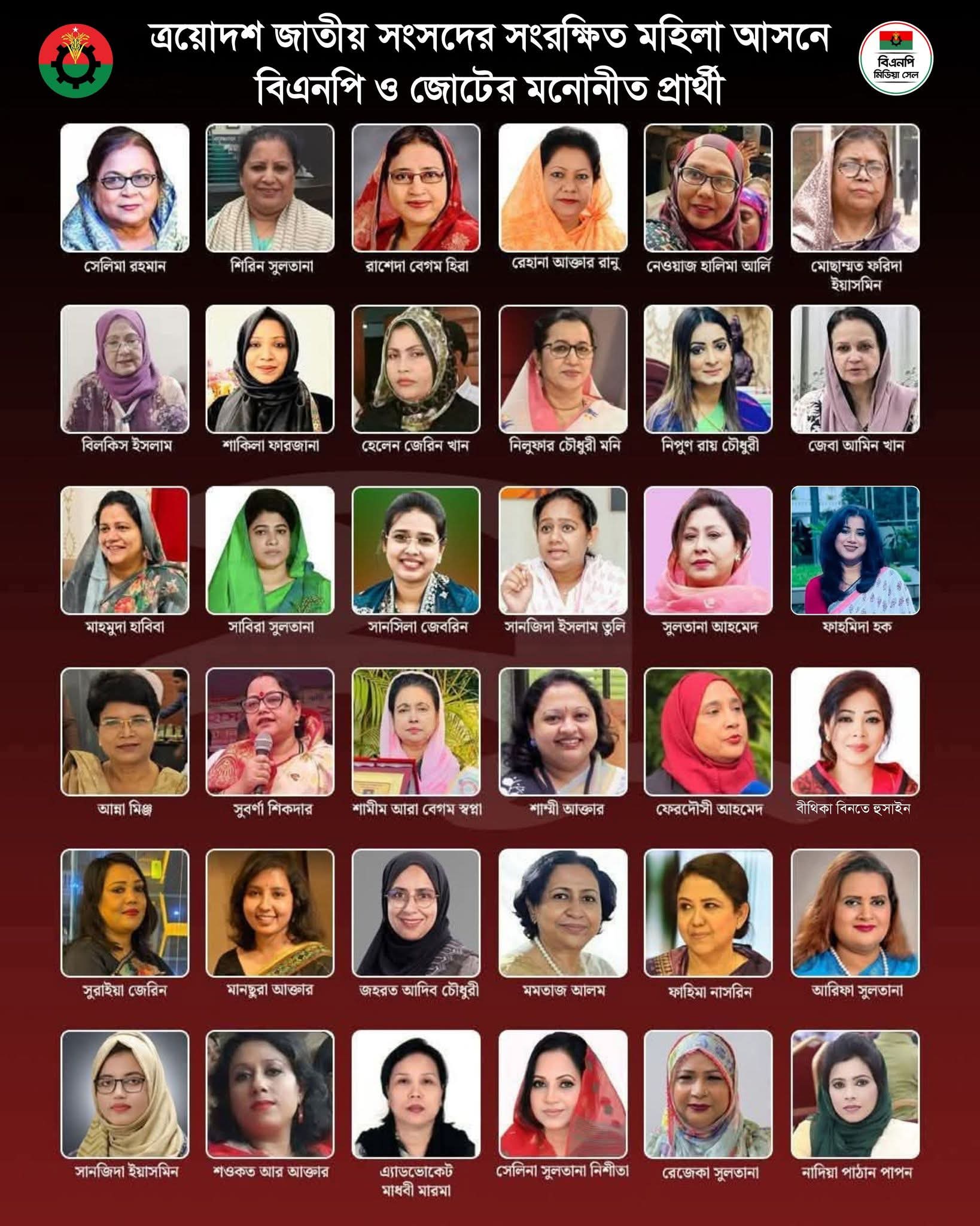 মনোনয়নপ্রাপ্তরা হলেন— সেলিমা রহমান, শিরিন সুলতানা, রাশেদা বেগম হিরা, রেহানা আক্তার রানু, নেওয়াজ হালিমা আর্লি, মোছাম্মত ফরিদা ইয়াসমিন, বিলকিস ইসলাম, শাকিলা ফারজানা, হেলেন জেরিন খান, নিলুফার চৌধুরী মনি, নিপুণ রায় চৌধুরী, জেবা আমিন খান, মাহমুদা হাবিবা, সাবিরা সুলতানা, সানসিলা জেবরিন, সানজিদা ইসলাম তুলি, সুলতানা আহমেদ, ফাহমিদা হক, আন্না মিঞ্জ, সুবর্ণা শিকদার, শামীম আরা বেগম স্বপ্না, শাম্মী আক্তার, ফেরদৌসী আহমেদ, বীথিকা বিনতে হুসাইন, সুরাইয়া জেরিন, মানছুরা আক্তার, জহরত আদিব চৌধুরী, মমতাজ আলম, ফাহিমা নাসরিন, আরিফা সুলতানা, সানজিদা ইয়াসমিন, শওকত আর আক্তার, মাধবী মারমা, সেলিনা সুলতানা, রেজেকা সুলতানা ও নাদিয়া পাঠান পা